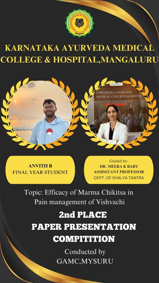Congratulations to Anvith B. Final year BAMS Guided by Dr.Meera K. Assistant Professor for Winning Second place in Paper presentation competition conducted by GAMC, Mysore.