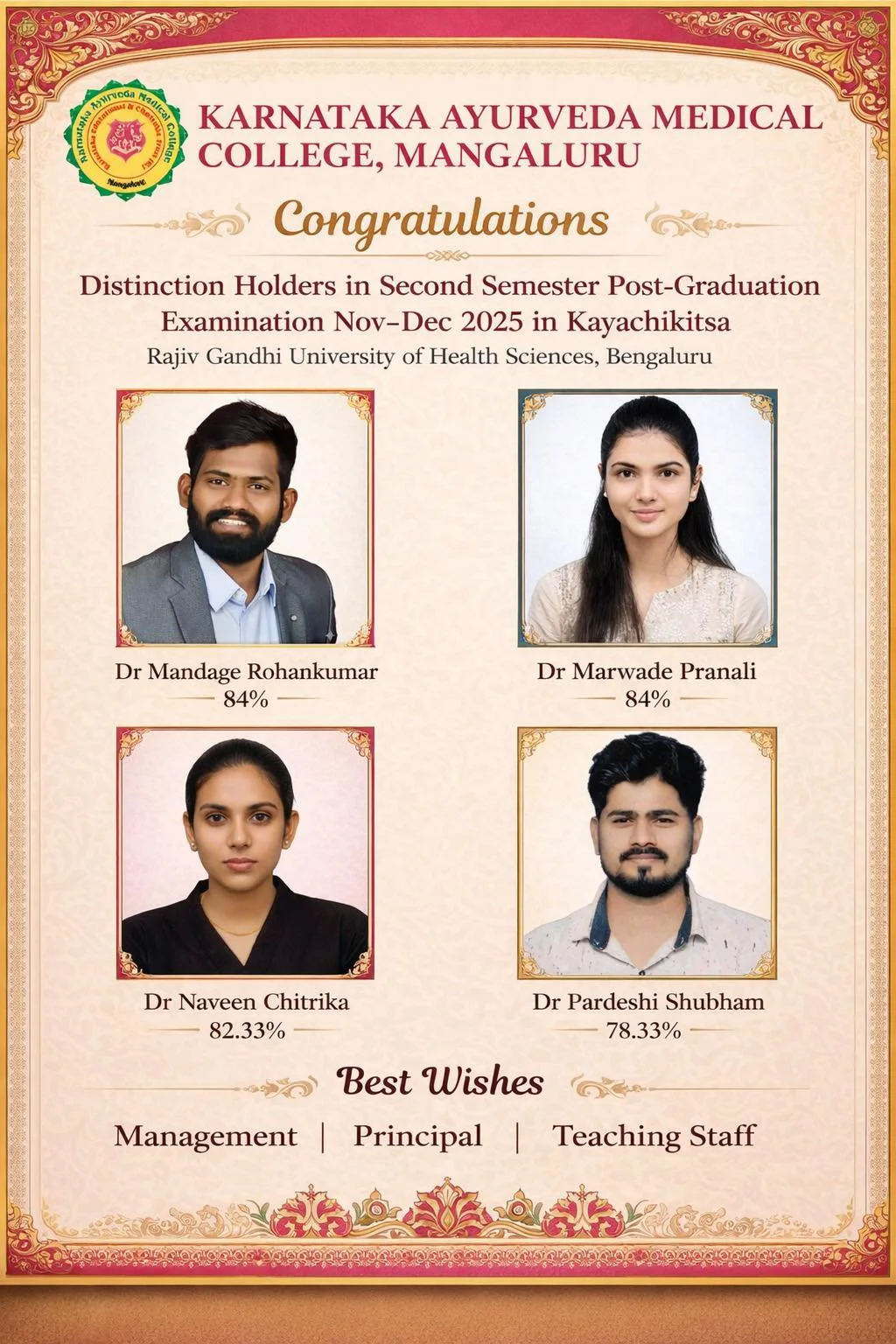 Congratulations to Ms Sanjana, Final year BAMS for securing best paper at WAC Dehradun. Paper guided by Dr Jyothi Madam.