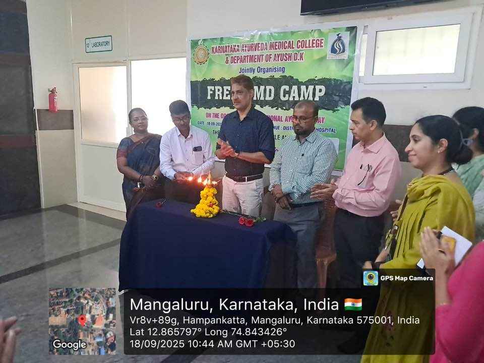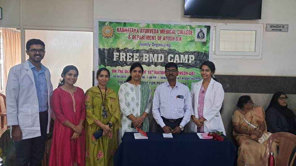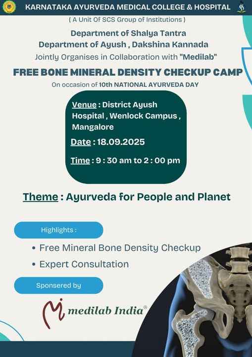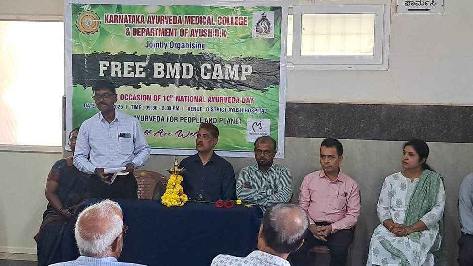 As part of 10 TH National Ayurveda Day,the Department of Shalya tantra, Karnataka Ayurveda Medical College and Hospital, Ashoka Nagar, in collaboration with the Department of Ayush,Dakshina kannada and Medilab India, organized a Free bone mineral density camp at District AYUSH Hospital Wenlock campus on September 18 from 9:30am-2:00pm. The chief guest of the inaugural program Dr. Iqbal, Chief Medical Officer of the District AYUSH Hospital, who inaugurated the camp and informed about the importance of bone density screening in today. Dr. Zahid Hussain, Medical Superintendent of the District AYUSH Hospital, and Dr. Ajith, Dr. Basavaraj, Dr. Yashvita, Dr. Prakash, Dr. Hemavani were present. Karnataka Ayurveda College Medical Superintendent and Head of the Department of Surgery Dr. Udaya D. K welcomed the gathering. Dr. Shobharani, from District Ayush Hospital, proposed the vote of thanks. Professors of the Department of Shalya tantra Dr. Abhinethri and Dr. Meera, Dr. Rashmi were present. The camp was conducted in collaboration with Medilab and a total of 108 patients were screened for bone density.