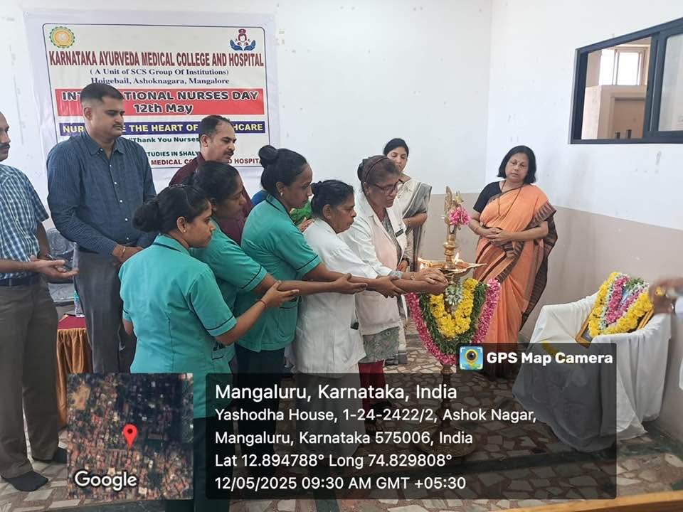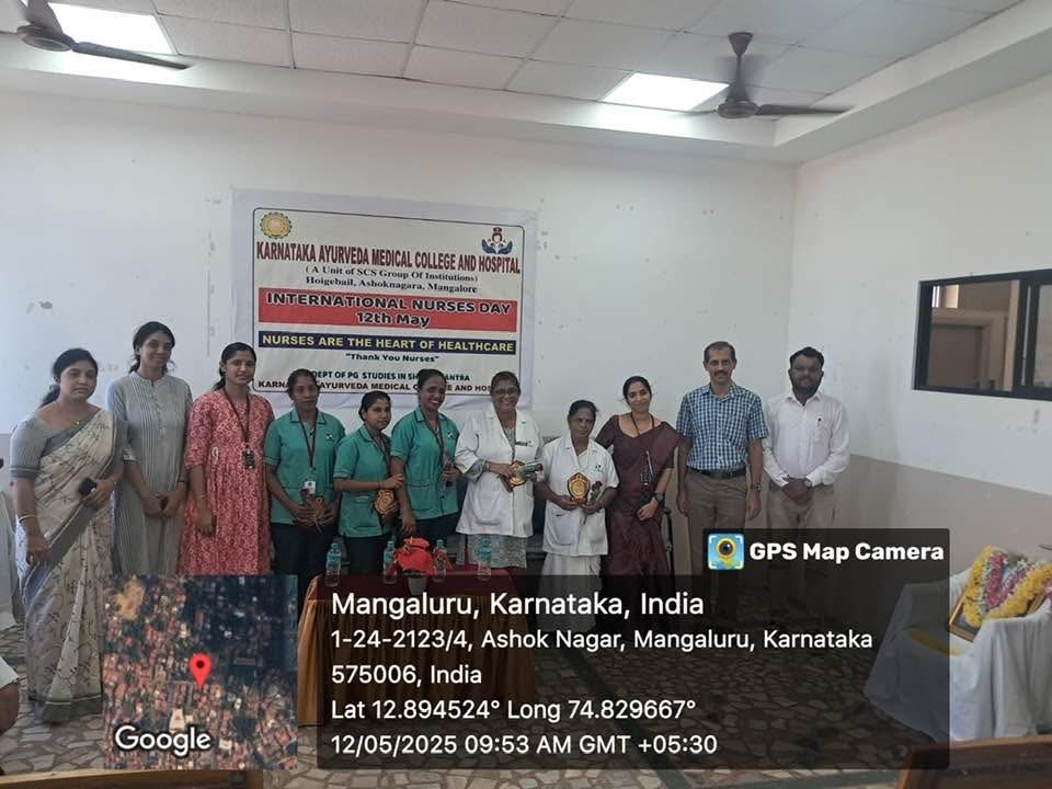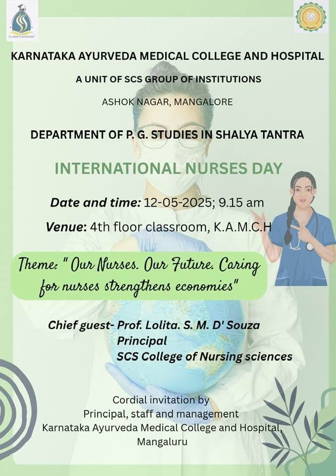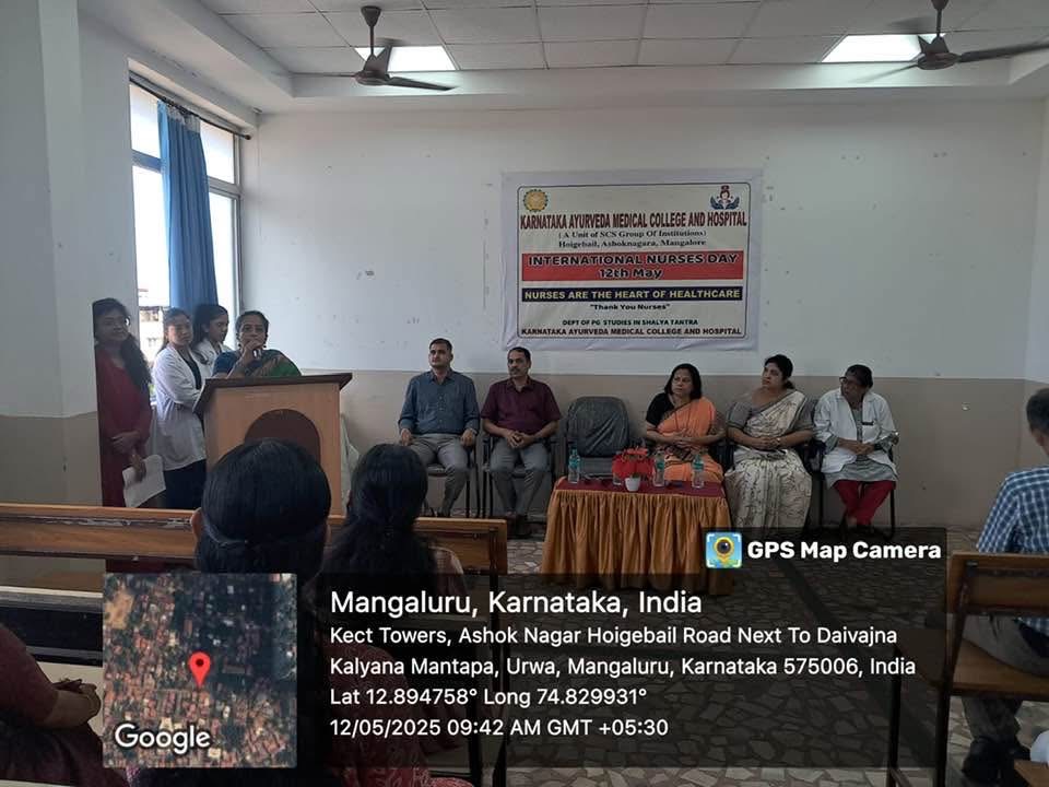 On account of International Nurses Day, Department of PG Studies in Shalya tantra, Karnataka Ayurveda Medical College & Hospital, Ashok Nagar, Mangalore organised a programme on 12/05/2025 at 9.15am at KAMCH. To begin with the programme, prayer was delivered by Internee Ms. Arpita. The session was inaugurated by Dr. Ravi . Rao. S, Principal, KAMC, Prof. Mrs. Lolita. S. M. D’souza, Principal, SCS College of Nusring Sciences, Dr. Jacintha Meena D’Souza, Vice Principal, KAMC, Dr. Abinethri. Hegde, Prof., Department of Shalya tantra,Dr. Ajith. Kamath, Medical Director, KAMCH, Dr. Ravindra. Bhat, Deputy Medical Director. Dr. Meera. K. Baby, Asst professor, Dept of Shalya tantra, Dr. Vidhya. N, Asst professor, Dept of Shalya tantra, and other faculties were also present for the occasion.