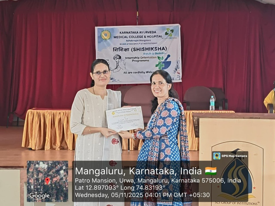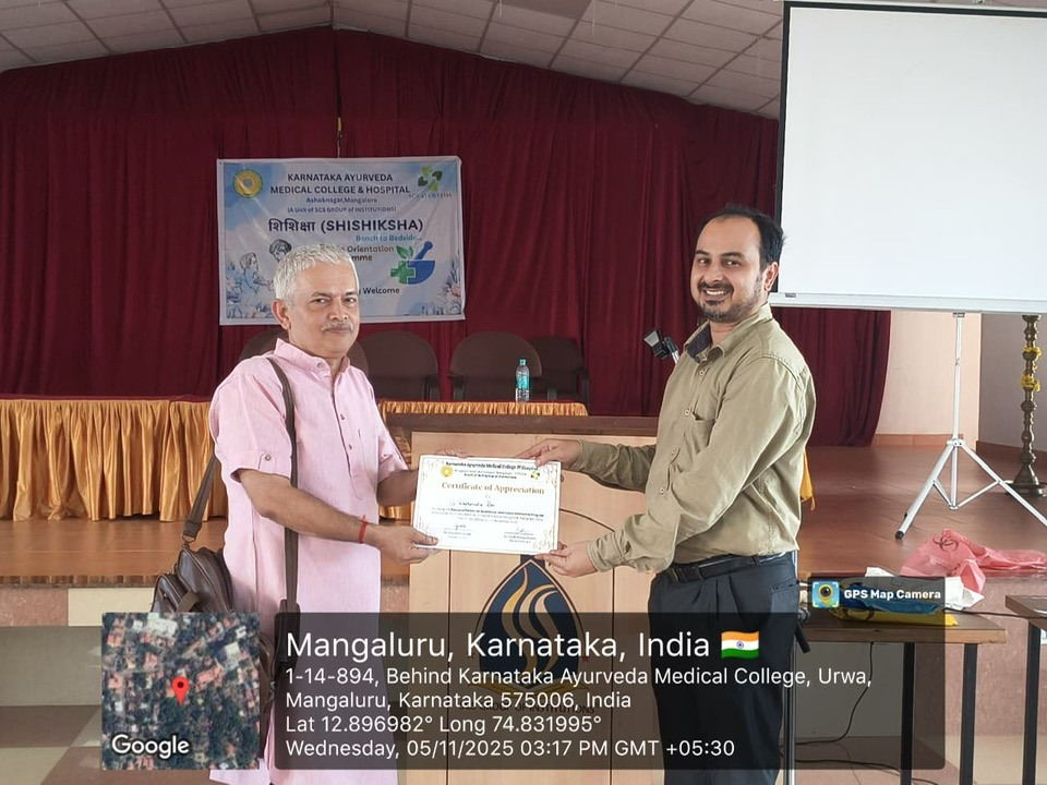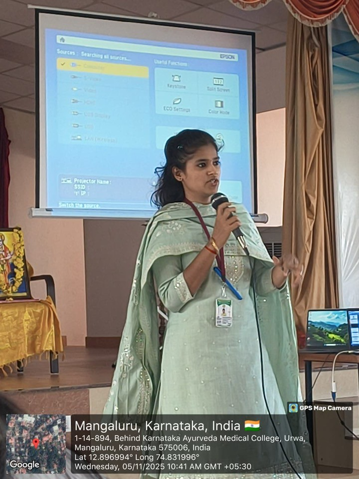 The afternoon session featured two informative talks — Dr. Raghavendra Rao, Professor and Head, Department of Swasthavritta, delivered an insightful lecture on biomedical waste management, hospital infection control, and patient safety goals; followed by Dr. Swapna Bhat, Professor and Head, Department of Dravyaguna, who spoke on the Drugs and Magic Remedies (Objectionable Advertisements) Act, highlighting its relevance in ethical medical practice.