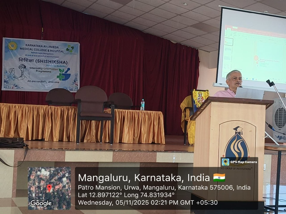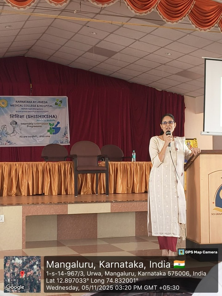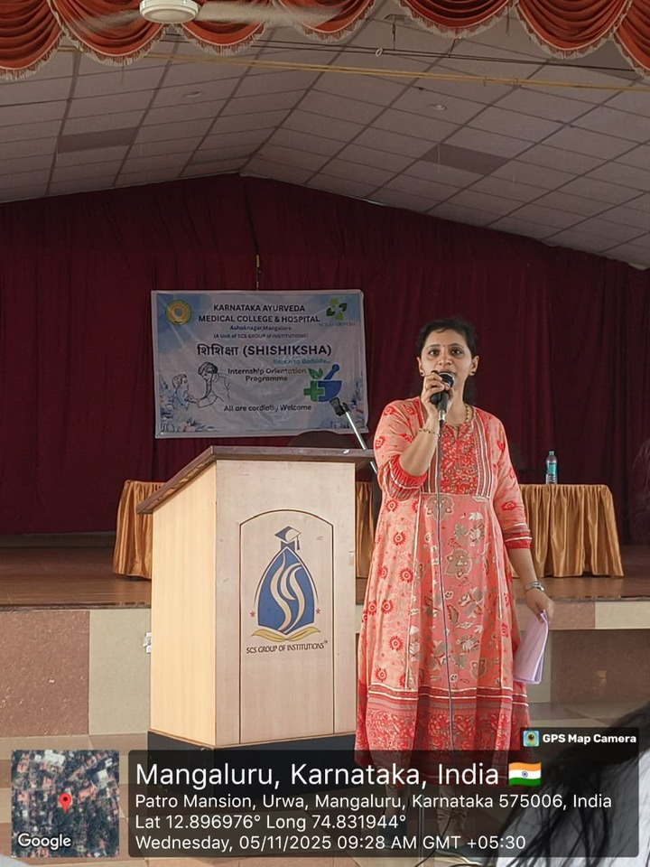 The third day of the Internship Orientation Program “Shishiksha 2025” began with an enlightening session by Dr. Sahana M, Associate Professor, Department of Kayachikitsa, on the topic “Bridging Knowledge to Clinical Practice.” She emphasized the importance of integrating theoretical knowledge with practical clinical application and shared valuable guidance for effective patient care.