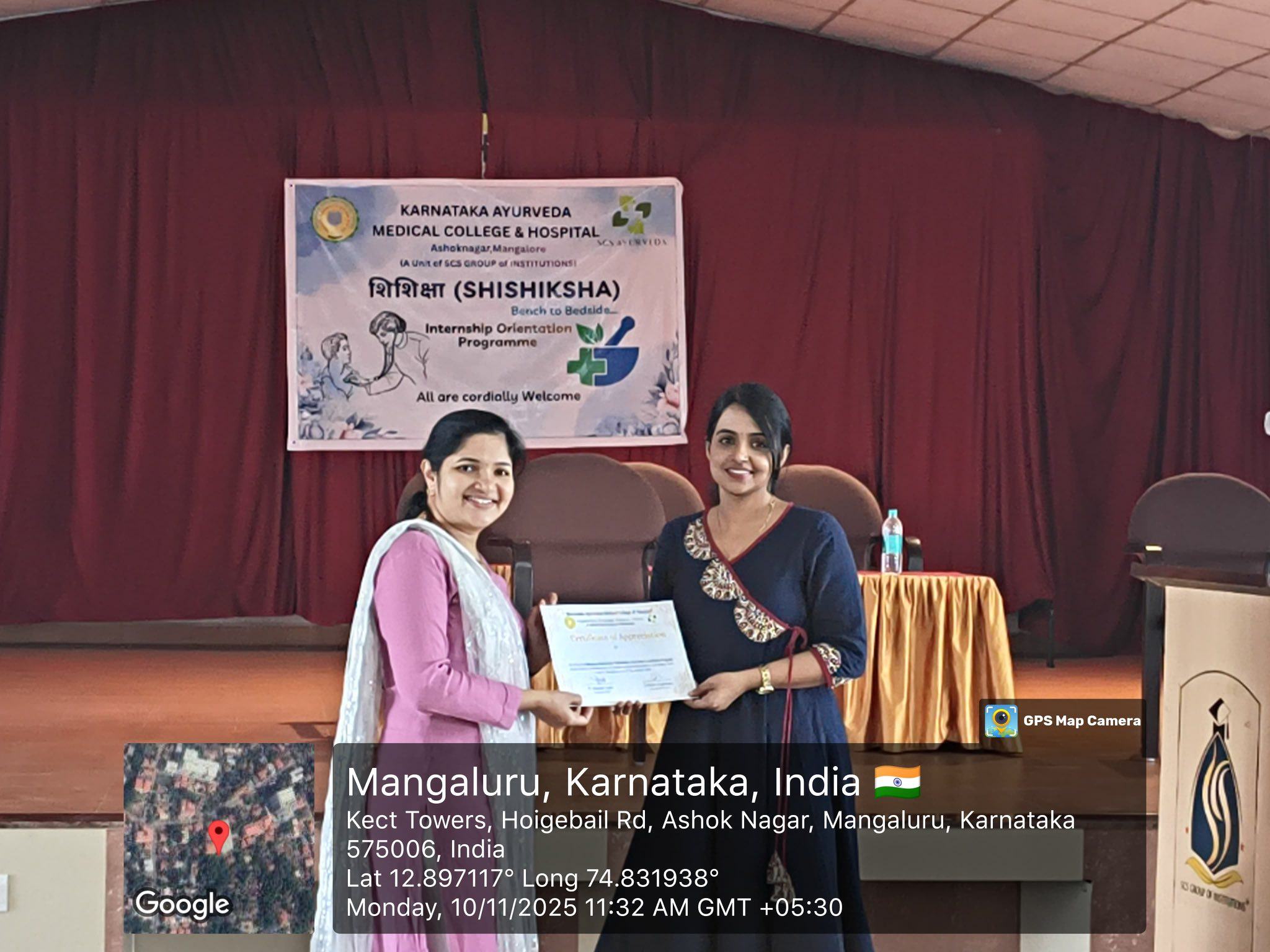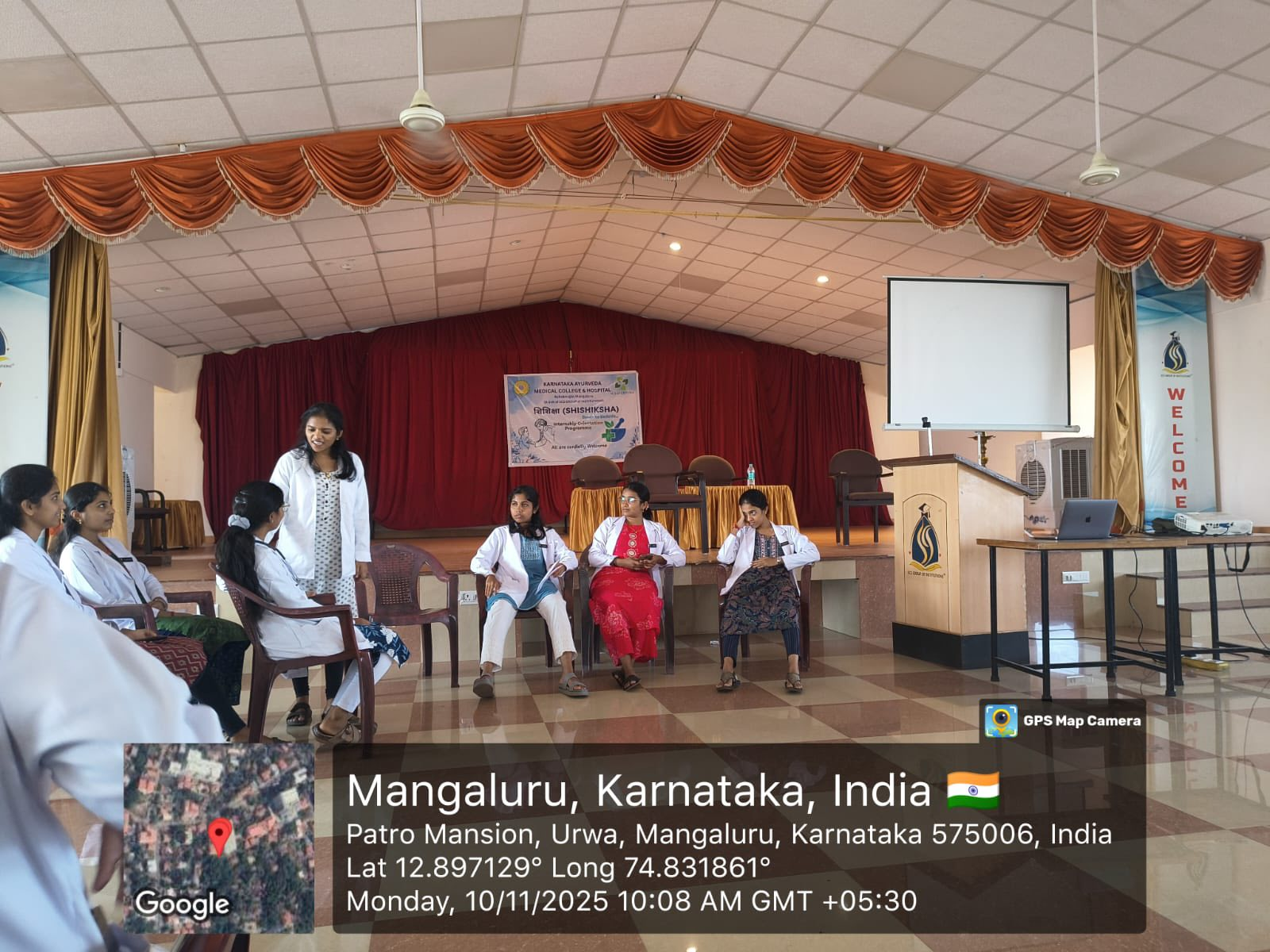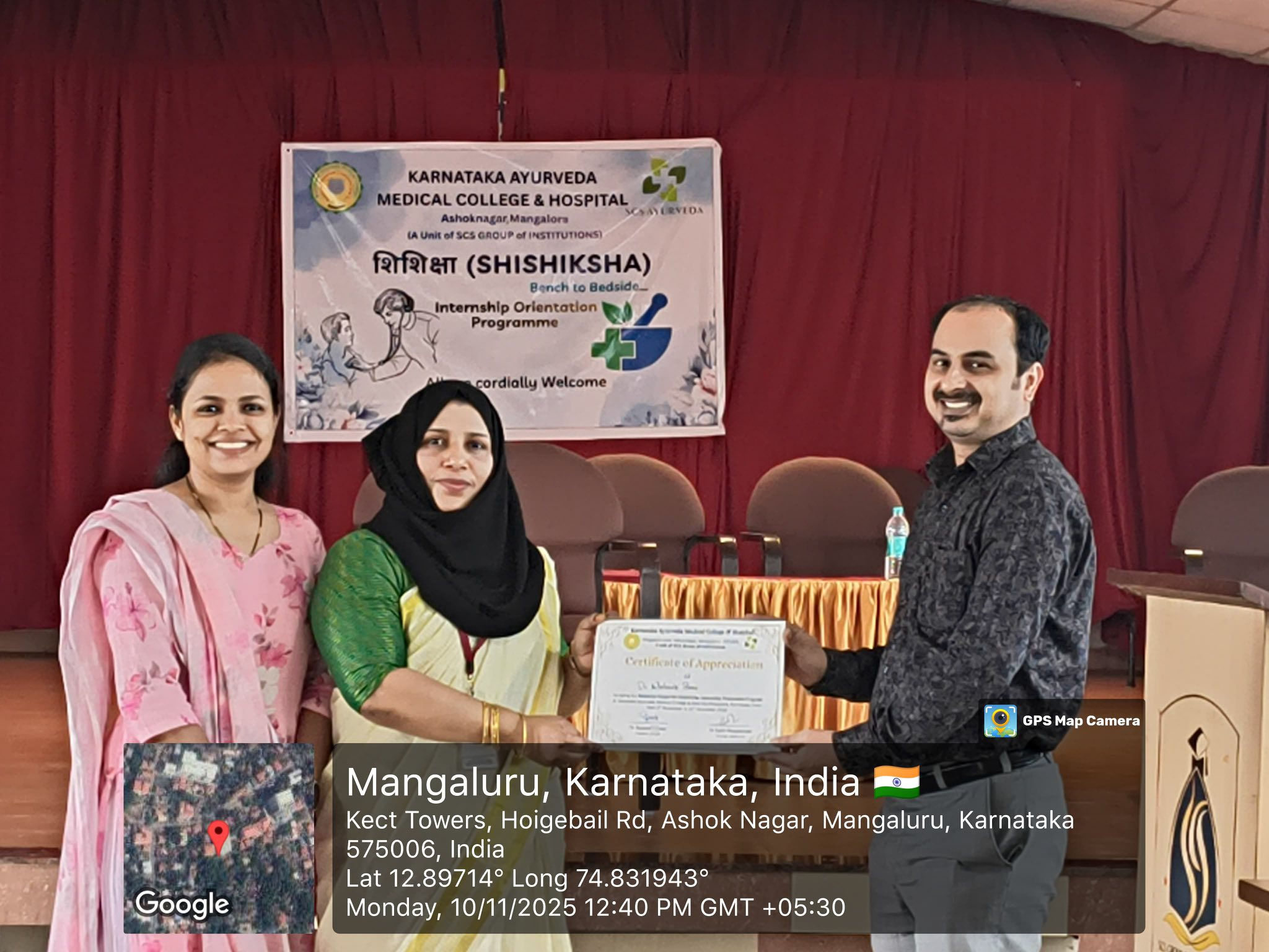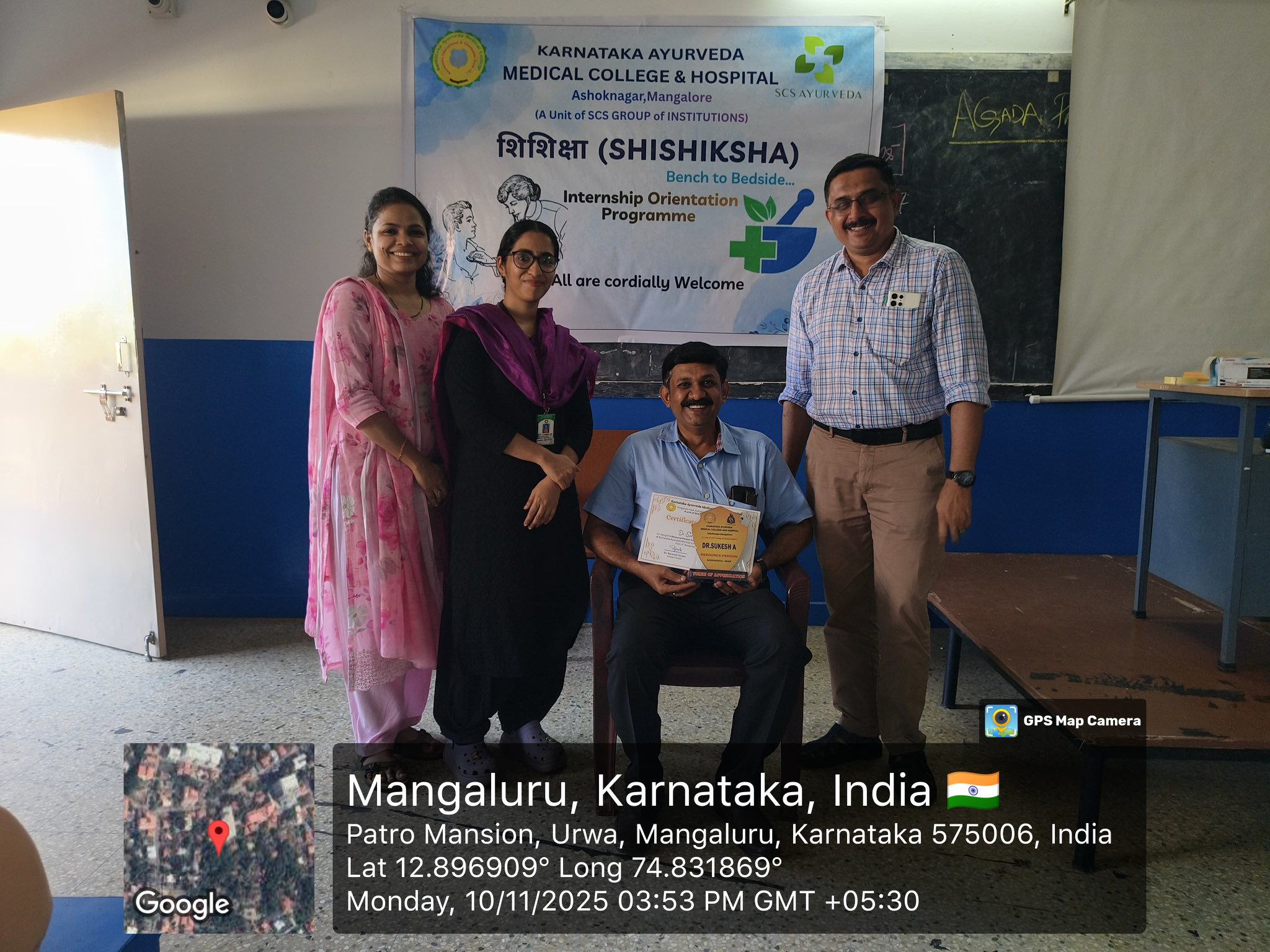 The afternoon session was led by Dr. Sukesh A, Professor, Department of Shalyatantra, Alva’s Ayurveda Medical College, Moodbidri, who presented an engaging session on Casualty and Emergency Management. He explained essential emergency response protocols, first aid measures, and the role of interns in handling critical situations with confidence and composure.