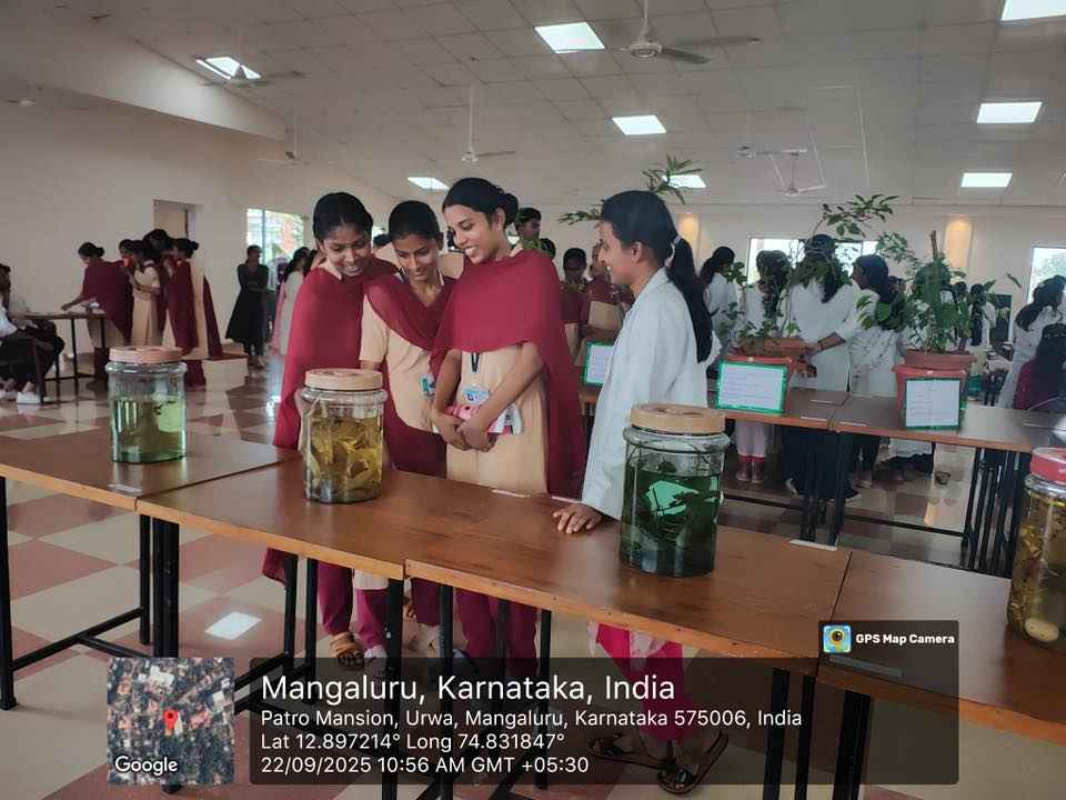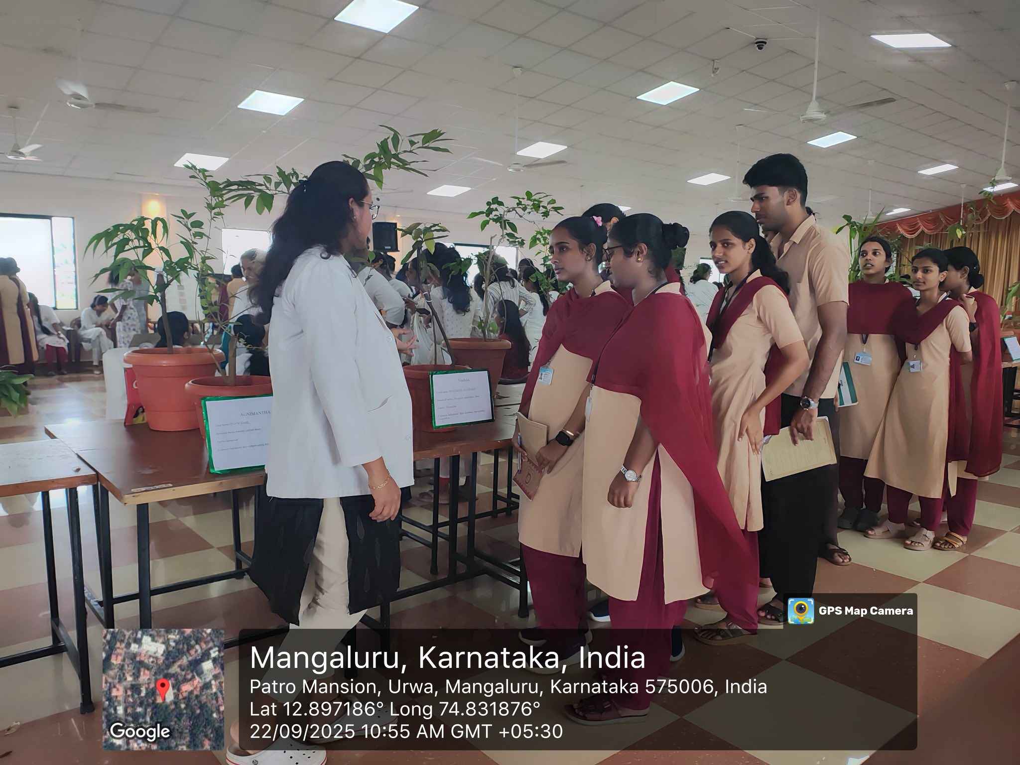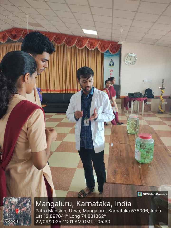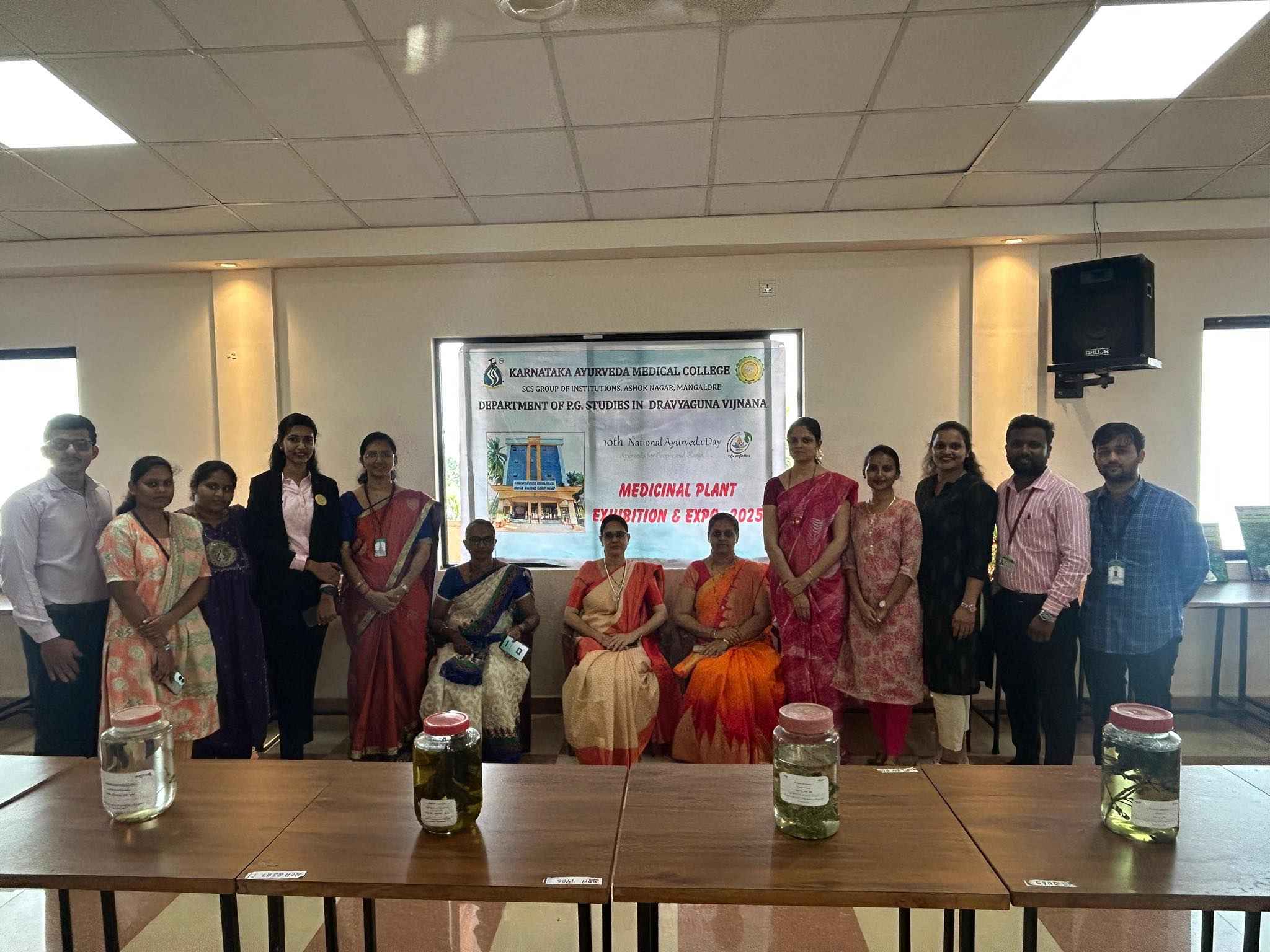National Ayurveda Day, Department of PG studies in Dravyaguna vijnana, Karnataka Ayurveda Medical College, A Unit of SCS group of institutions, Manglore organised an exhibition & expo of Medicinal plants for general public on 22-09-2025. The exhibition showcased rare live medicinal plants with a note on their uses, some drugs which are used in the dry form were also displayed. Rare plants collected from many places and stored in preservatives in jars were also a part of the exhibit. Dr Swapna, Principal and HOD of Department of Dravyaguna Vijnana inaugurated the expo and gave awareness regarding the uses of the herbal plants in disease as well healthy state. Staff of the Department of Dravyaguna Vijnana and PG students took active part in explaining the herbs to around 150 visitors.