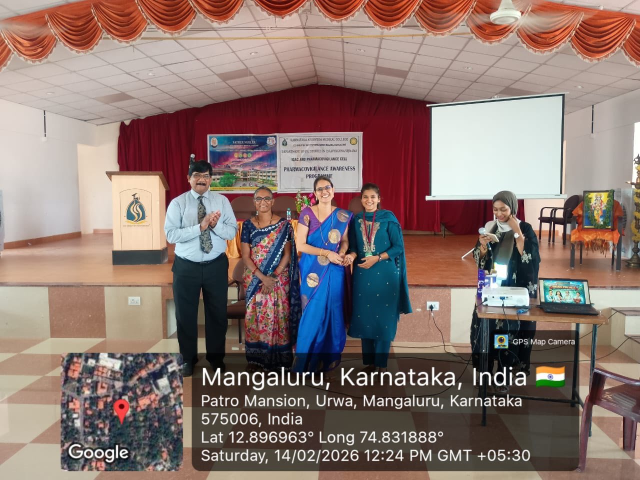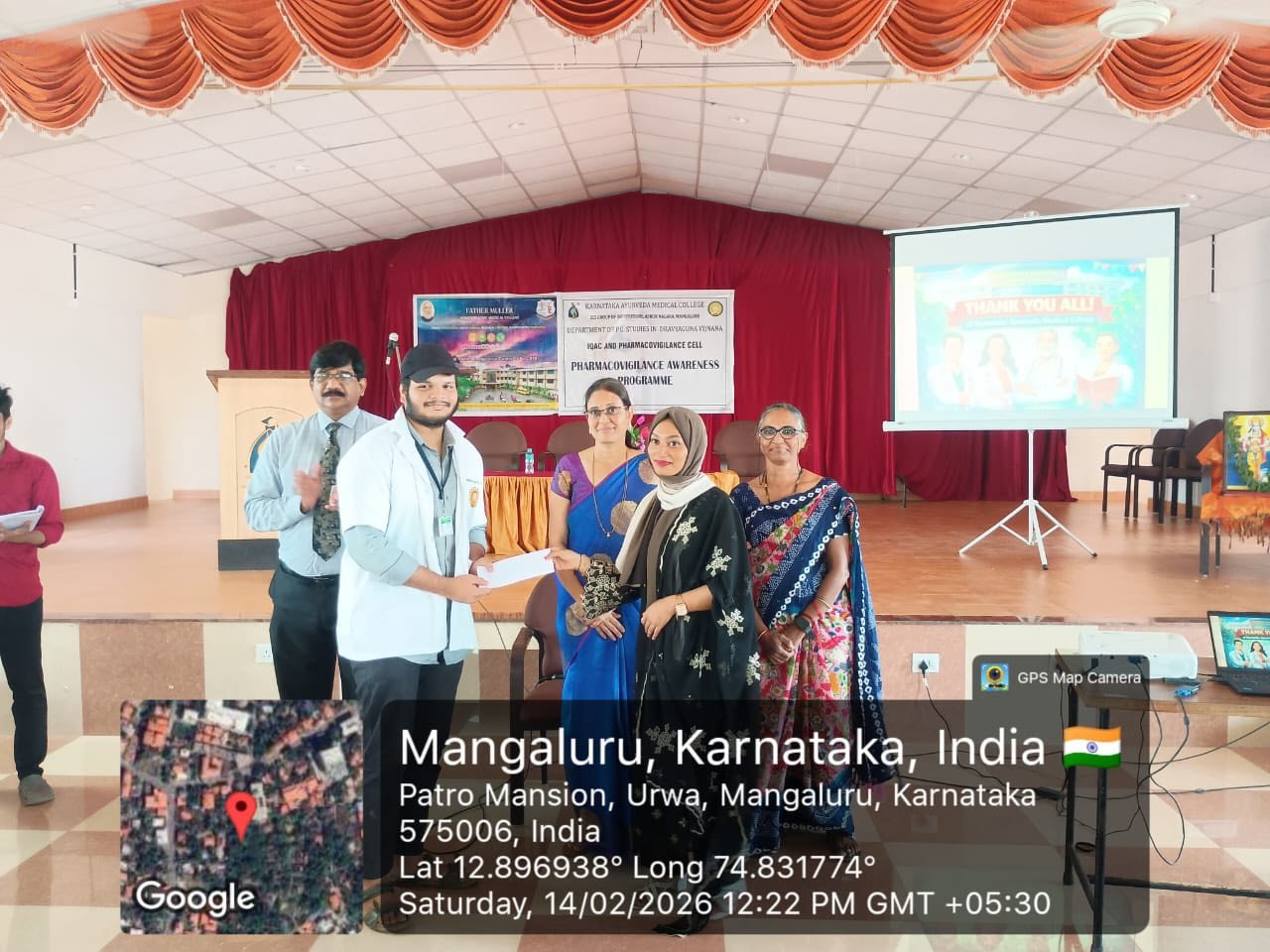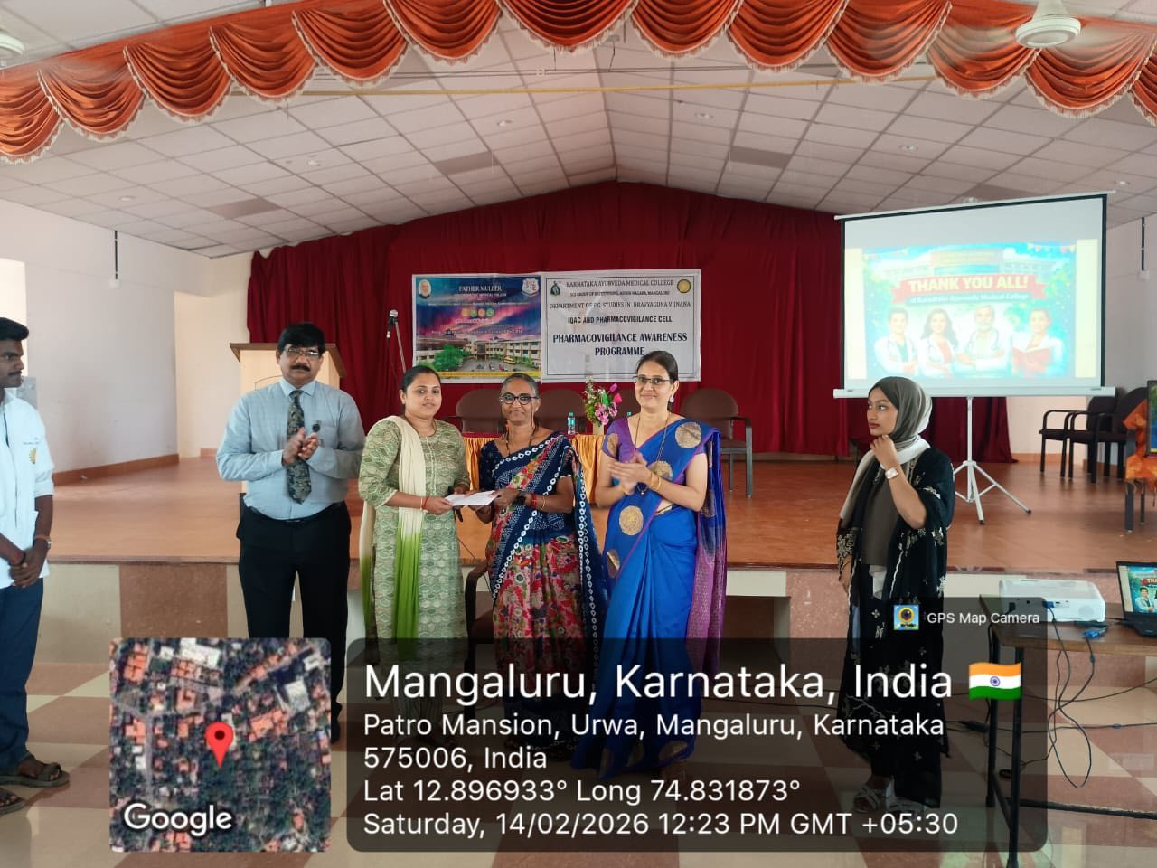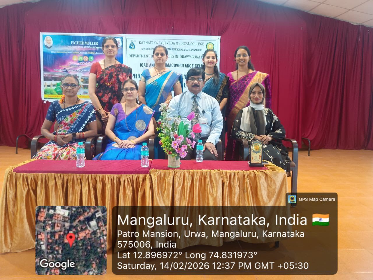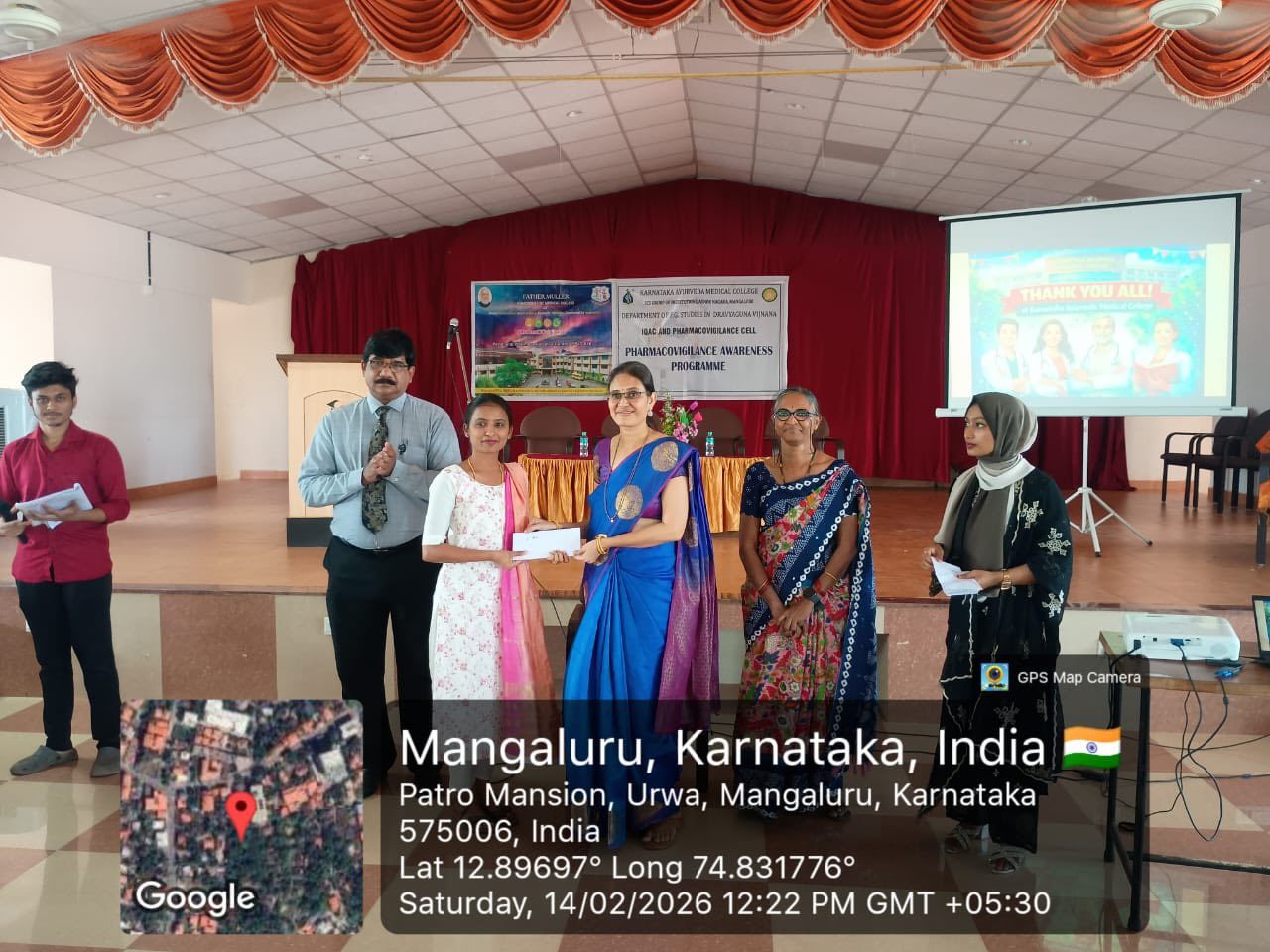 Pharmacovigilance Awareness Programme was organised by the Department of P.G. studies in Dravyaguna Vijnana, IQAC and Pharmacovigilance Cell, Karnataka Ayurveda Medical College, Mangalore in association with Father Mullers Homeopathic College, Mangalore on 14th February 2026 at KAMC Auditorium. The formal program for the event was inaugurated by lighting the lamp with the dignitaries on the Dias where Resource persons Dr E S J Prabhu Kiran Principal and Co ordinator – Father Mullers Homeopathic College, Mangalore, Dr. Fathima Soudath, Junior Research Fellow-PPvC010, Father Mullers Homeopathic College, Mangalore, Dr. Swapna Bhat, Professor and Head, Department of Dravyaguna Vijnana, and Dr. Sridevi, Professor, Karnataka Ayurveda Medical College Mangalore. Keynote address was delivered by Dr. Swapna Bhat, Convener of the IQAC Pharmacovigilance cell, Professor and Head, Department of Dravyaguna Vijnana, Karnataka Ayurveda Medical College, Mangalore. Master of the ceremony was Dr Srijaya V. Prabhu, Associate Professor, Department of Dravyaguna Vijnana and the welcome speech was given by Dr Soumyashree K M, Associate Professor, Department of Dravyaguna Vijnana. Soon after the formal function Interactive Quiz session on Pharmacovigilance was carried out by Dr E S J Prabhu Kiran and Dr. Fathima Soudath with four teams comprising of 16 students involving the UG students and PG Scholars. Winner and runner teams were awarded with cash prize. Consolation prizes were awarded to the audience participants. The formal program concluded with the vote of thanks rendered by Dr B. Shivani Rao, Assistant Professor, Department of Dravyaguna Vijnana, Karnataka Ayurveda Medical College, Mangalore.