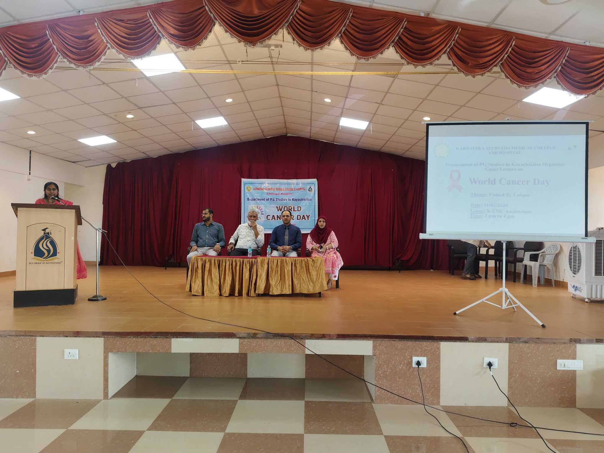 The Department of PG Studies in Kayachikitsa, Karnataka Ayurveda Medical College & Hospital, Ashoknagar, organized a guest lecture on 11th February 2026 to observe World Cancer Day. The programme was based on the theme “United by Unique.”