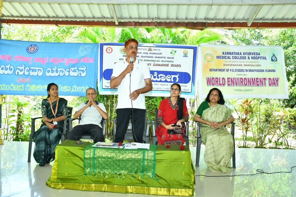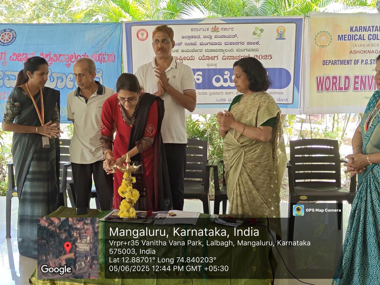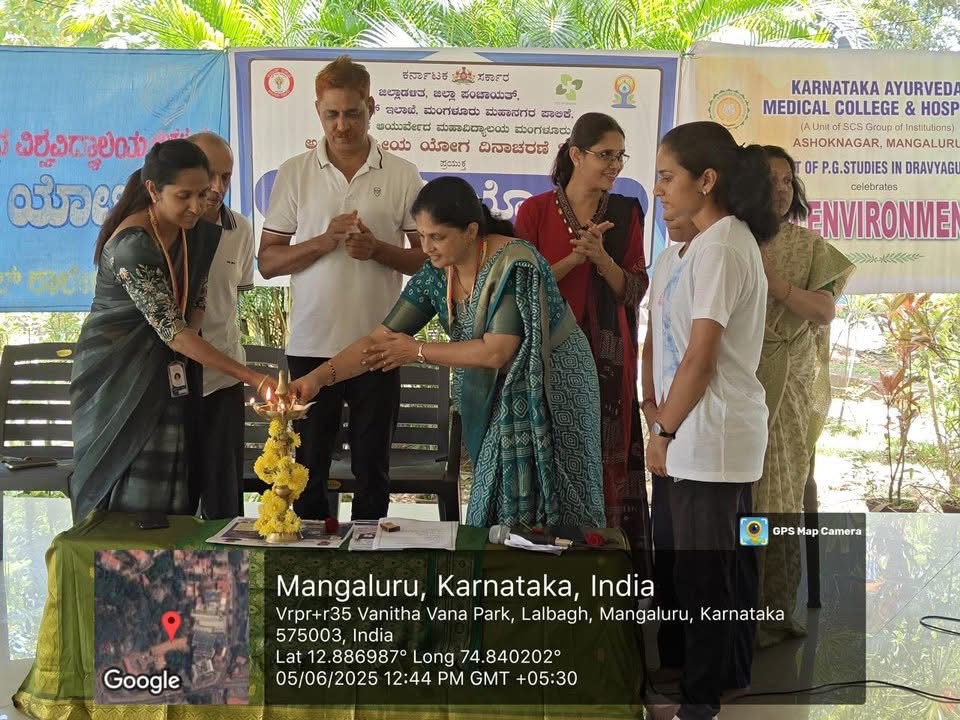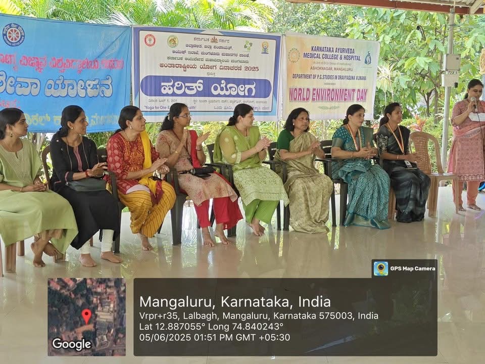 On the occasion of World Environment day and 11th International Yoga day “Harith Yoga“ programme was organised by AYUSH department in Association with Karnataka Ayurveda Medical College, Ashok nagar, Mangaluru ( Dept of PG studies in Dravyaguna Vijnana, Dept of Swasthavritta and NSS Unit) on 05-06-2025 at Indira Priyadarshini Park, Hathill, Mangalore